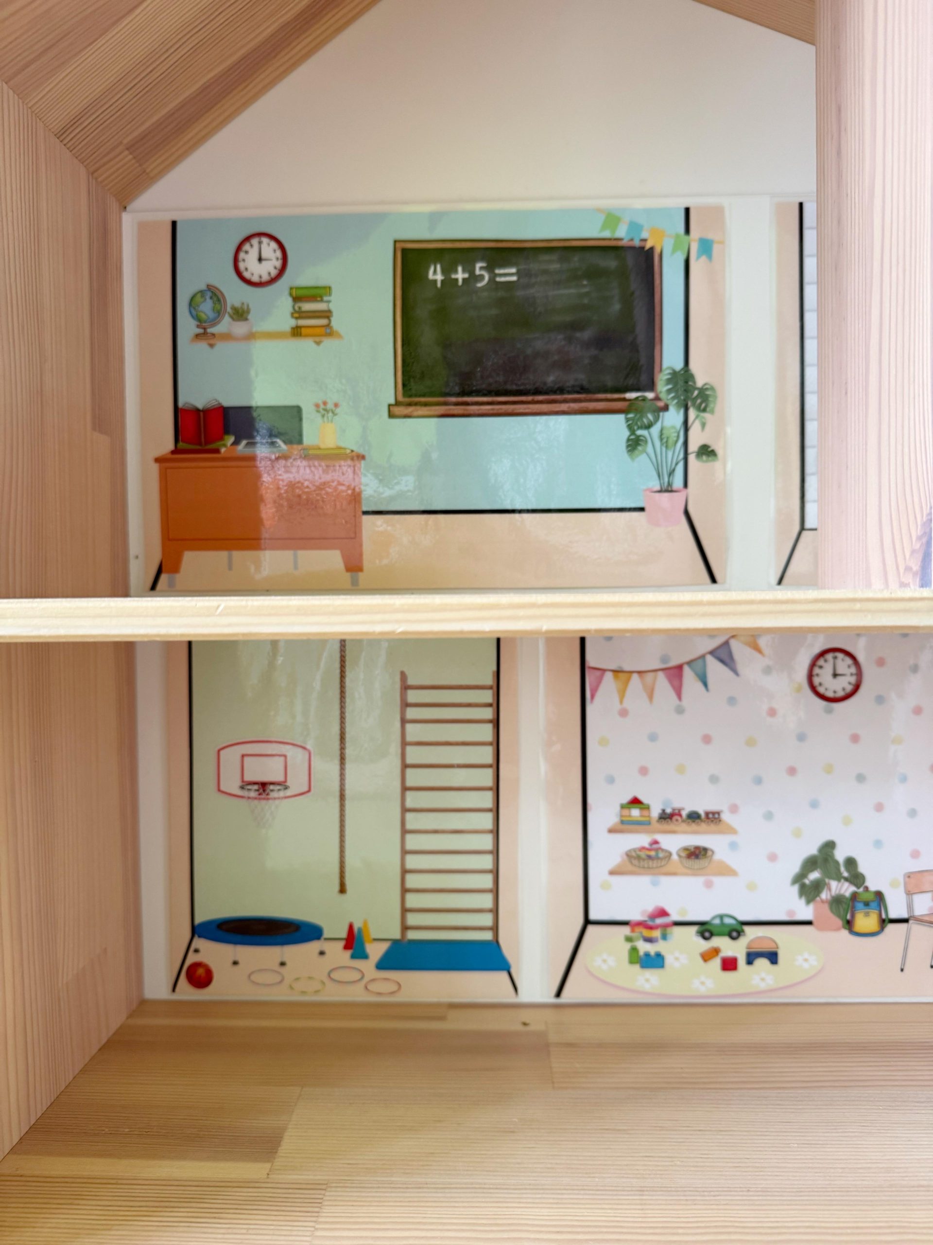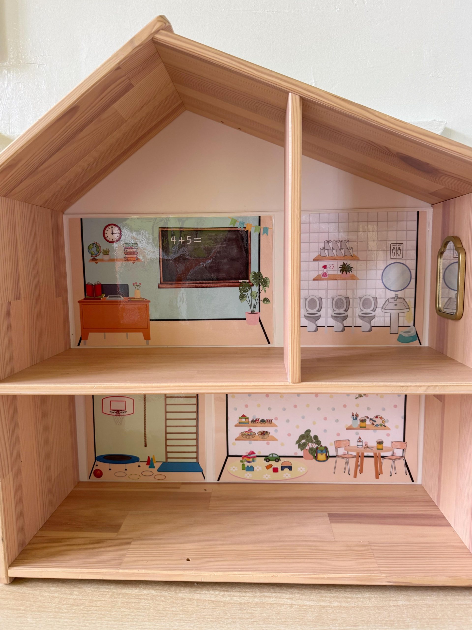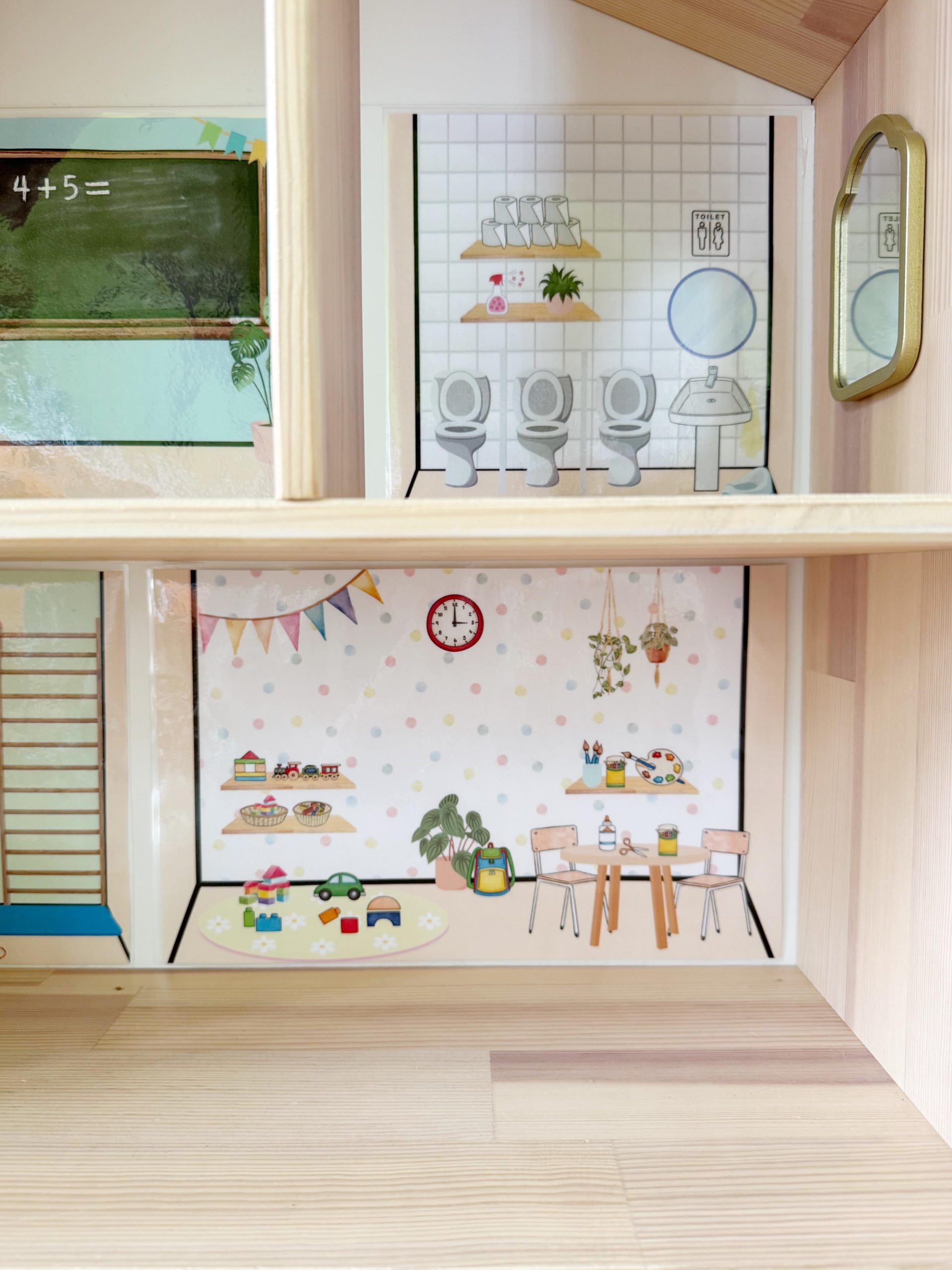 De kleine wereldjes bundel tovert jouw Ikea poppenhuis om tot een heus klein speelparadijs in thema “school” Jij hoeft de achtergronden alleen maar te printen, te lamineren en te bevestigen op de correcte plaats in het huis.